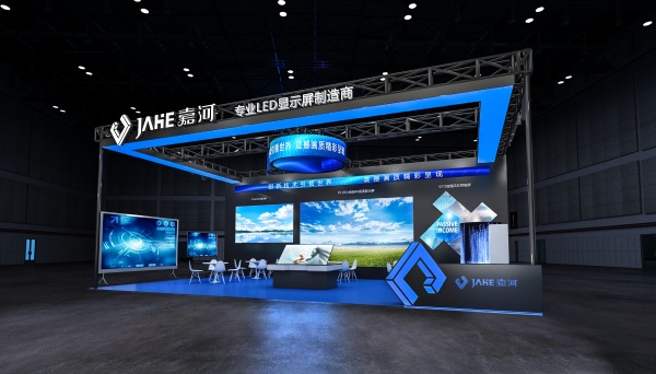 展台顶部有醒目的 “JAHE 嘉河 专业 LED 显示屏制造商” 的标识,明确传达了展台的品牌和业务范围。展台内部分为多个展示区域,每个区域都有不同的 LED 显示屏展示。