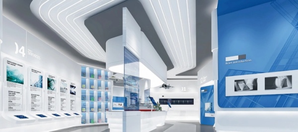 本次展馆设计色彩是以海洋蓝、暖白为主要搭配色,力求表现企业整体形象,既体现时代感,又能突出企业特色,将企业文化理念融合其中,贯穿于整个展厅,在展示企业形象的同时,感受精神层次的内涵。