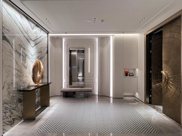 步入玄关,大鹏展翅气势磅礴。与中轴对称的背景岩板,在色彩、质地、肌理的搭配上和谐统一,彰显出一种既克制又极具张力的空间美感。