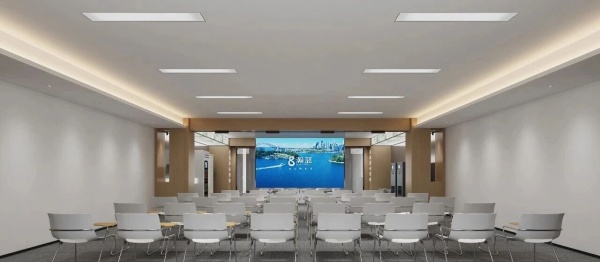 走进这里,首先被简约大气的空间质感所吸引。浅木色饰面包裹的区域与纯白墙面形成柔和对比,线性灯光均匀铺陈,让空间明亮又通透。整齐排列的白色座椅搭配简约桌台,满足多人研讨、培训的需求;尽头的高清大屏则为环保知识讲解、案例分享提供了清晰的视觉载体。